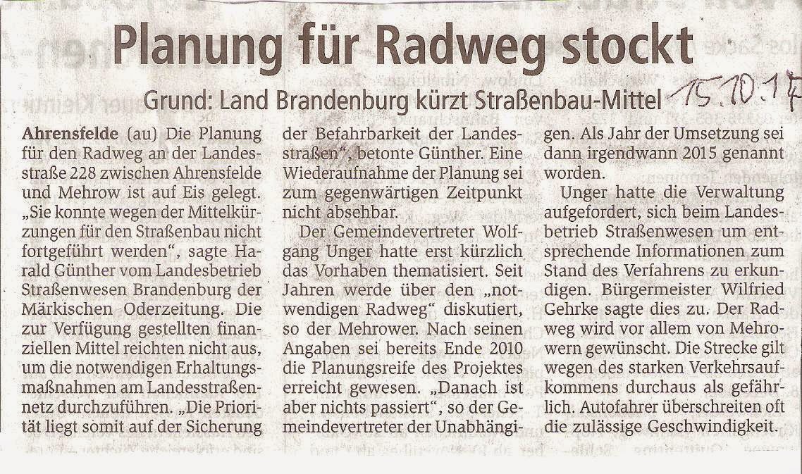 Neues vom Geh- und Radweg Mehrow-Ahrensfelde